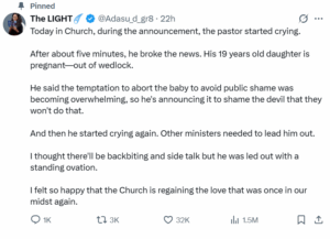 According to her post, her pastor broke down in tears after delivering his sermon. Not because the offering was low. Not because attendance dropped. But because he stood before his congregation and told them that his 19 year old daughter was pregnant out of wedlock.